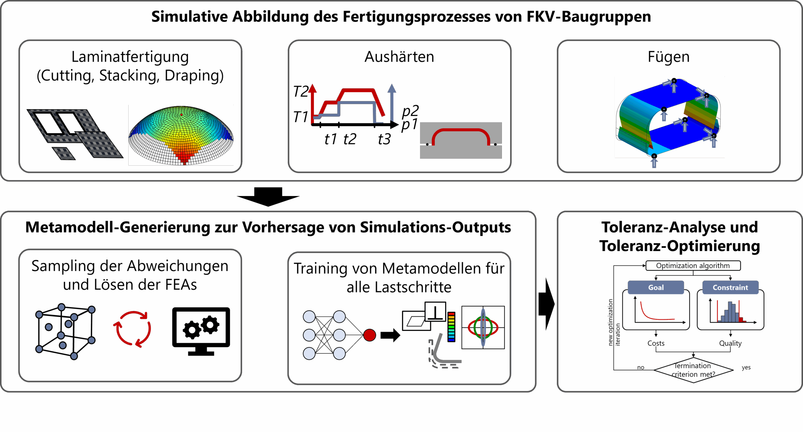 The consideration of variations and their functional restriction during the design of a product is an important task of tolerance management. Endless-fiber reinforced plastics (FRP), which are increasingly used due to their high lightweight potential, increase the complexity of this task due to their high number of design parameters. Geometric variations and residual stresses of individual components, which result from variations in the laminate design parameters, accumulate in the assembly and thus the final product. Additional residual stresses can occur in the assembly due to the assembly process, which have an impact on the supportable loads of the assembly. In the DFG project “Continuous analysis of variations during the design of endless-fiber reinforced composite structures assemblies” (project number 389616685), a method was developed for the consistent consideration of laminate deviations and their effects up to the utilization phase of the assembly. The method enables product developers to identify potential problems during the design of the composite structure and to take appropriate targeted countermeasures. Various parameters can be taken into account, such as material variations, fiber angle variations due to draping and manual work, or thickness variations. These not only influence the structural behavior, but also the deformation behavior during the curing of the individual parts. With the help of metamodels, the effects of these variations on the individual parts and on the assembly after the joining process can be predicted up to the utilization phase. This allows deformations and failure criteria to be examined at all process steps and the laminate parameters to be restricted with the help of a tolerance optimization so that the functional and failure-critical boundary conditions can be met.