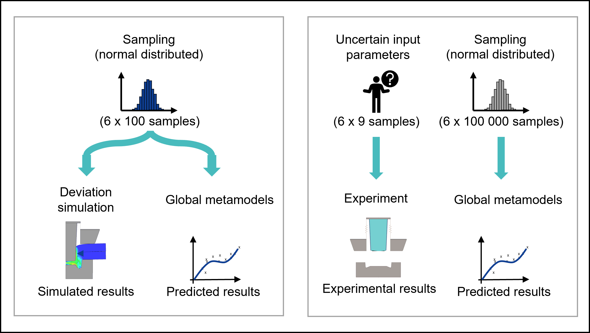 In modern lightweight design, mechanical joining processes such as clinching are becoming increasingly common. However, variations in tooling, process parameters, and material properties can cause significant deviations in clinch joint properties. In a joint study, the Chair of Engineering Design (KTmfk) at Friedrich-Alexander University Erlangen-Nürnberg and the Chair of Forming and Machining Technology at Dresden University of Technology present a two-stage evaluation of global polynomial regression metamodels. The models are first benchmarked against deviation simulations and then against experimentally observed scatter. While the metamodels accurately reproduce the numerical variation, the comparison with experiments reveals property-dependent discrepancies, which are attributed to accumulated uncertainties in the metamodels, the numerical simulations, and the experiments.