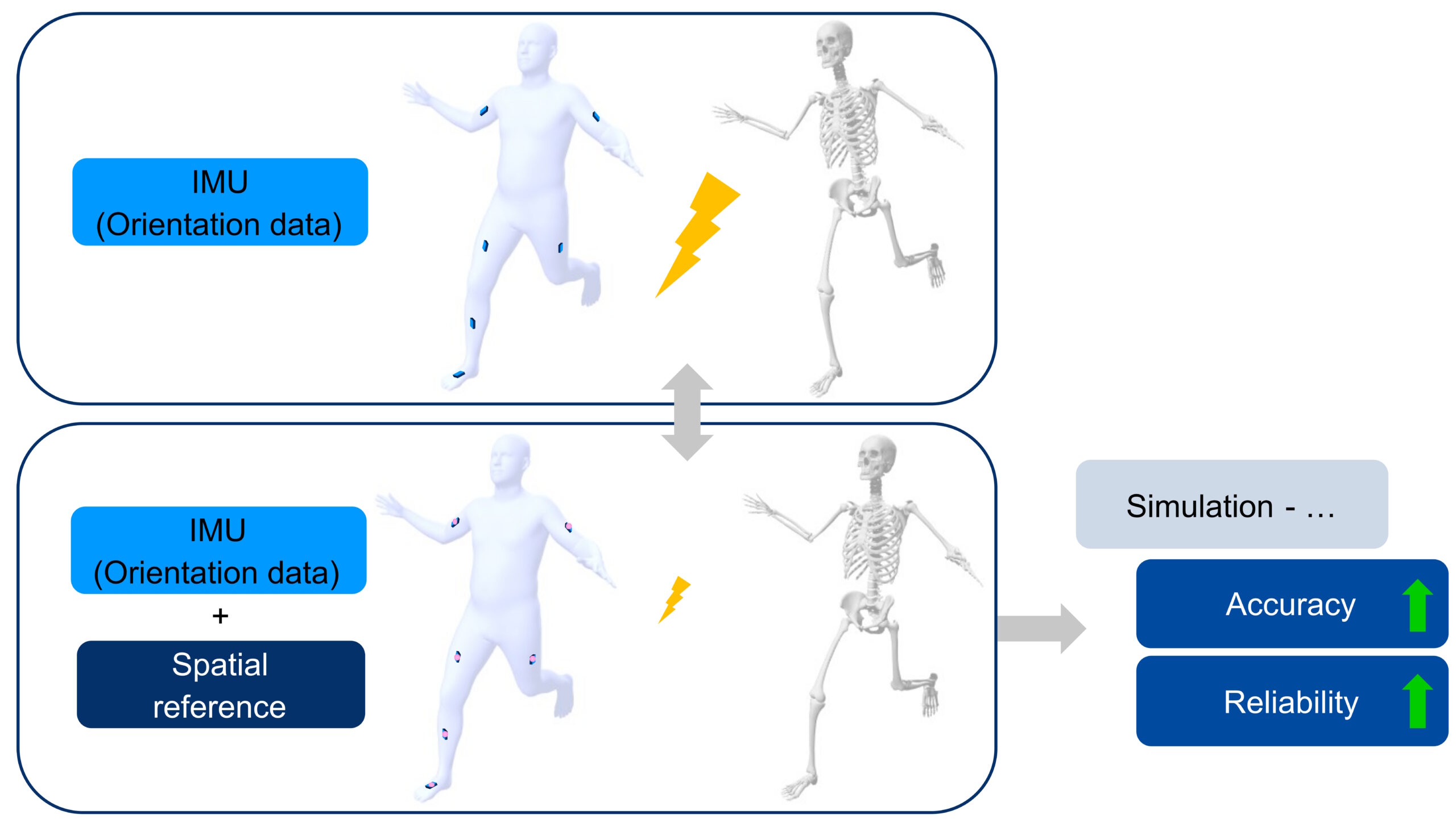 IMU-based systems for capturing human motion offer high flexibility and usability compared to marker-based systems, which are considered the gold standard. However, typical IMU-related errors such as calibration issues and sensor drift can affect data accuracy. A recent publication in Scientific Reports presents a multimodal approach that combines IMU-based orientation data with positional data from selected reference points. The simultaneous use of both sensor types enables effective compensation of IMU-specific errors and increases the accuracy and reliability of the kinematic and dynamic results of biomechanical simulations.